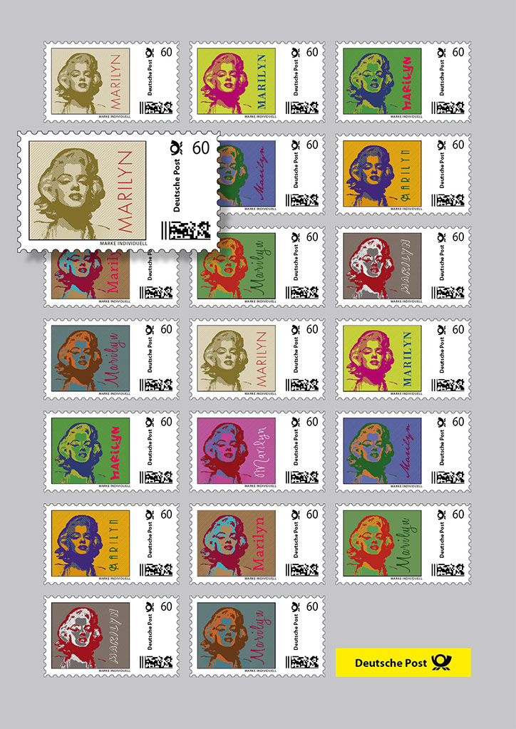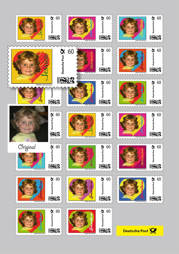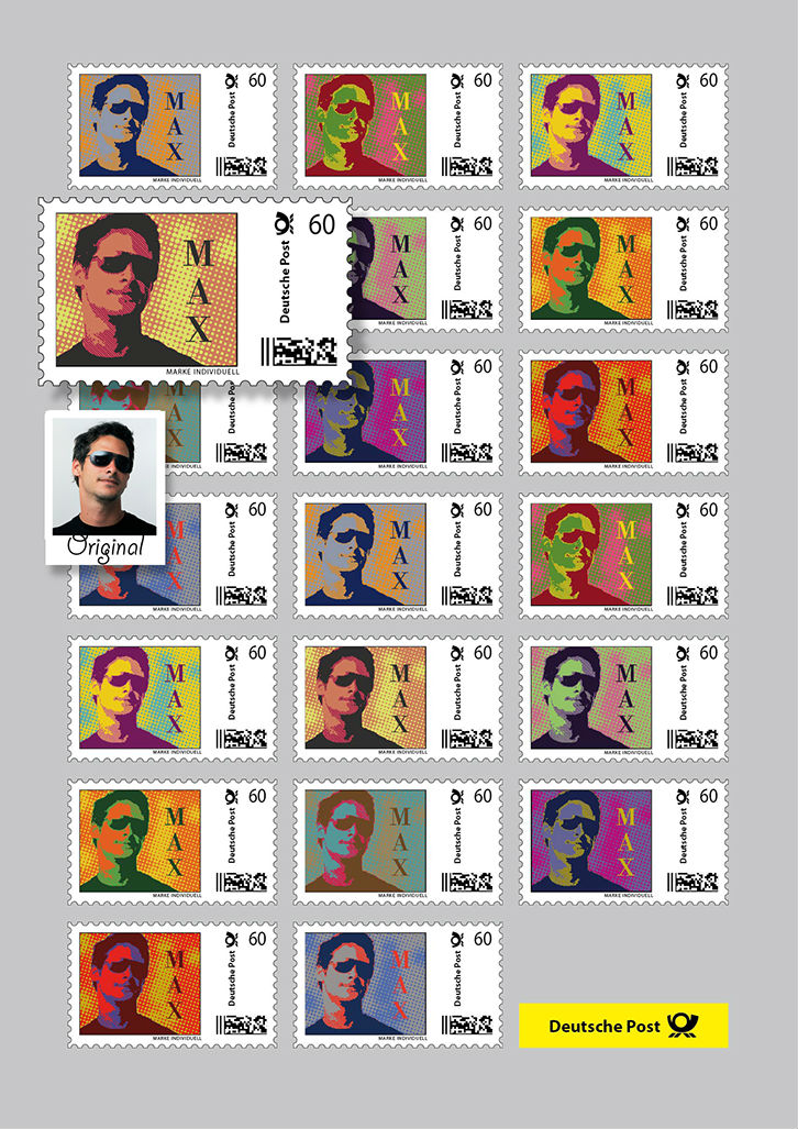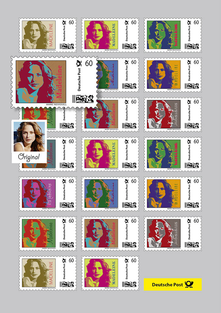 20 selbstklebende Briefmarken im individuellen PopArt-Stil auf einem DIN A4-Bogen.